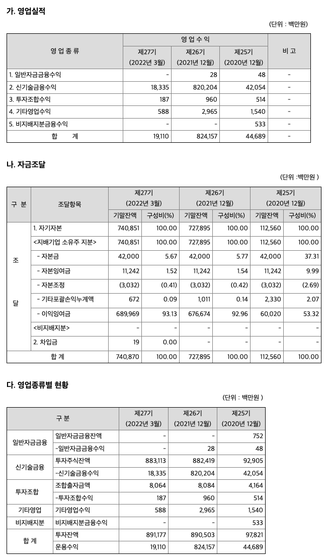 그러나 2009년도에는 여신금융부문이 점차 안정을 찾아가며 회수에 전념하였고, 기존의 전문분야인 신기술금융투자부문에 역량을 집중해 12억의 당기순이익을 실현할 수 있었습니다. 2010년에는 한국전자인증의 IPO 및 비상장주식 매각을 통한 투자수익과 기존 여신부문의 대출금회수 등을 통하여 이익 규모를 확대시켰습니다.