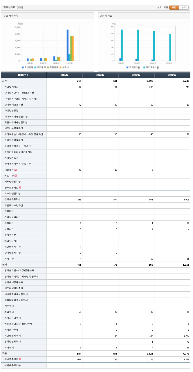 자산은 2018년 716억원, 2019년 831억원, 2020년 1295억원, 2021년 9230억원으로 증가하였습니다.