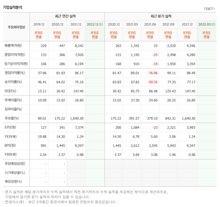 영업이익 : 2018년 129억원, 2019년 133억원, 2020년 366억원, 2021년 7926억원으로 전년동기대비 증가하였습니다. 2021년는 전년동기대비 2064.9% 증가하였습니다. 2021년 분기별로 보면 1분기 1195억원, 2분기 -25억원, 3분기 2498억원, 4분기 4259억원입니다.