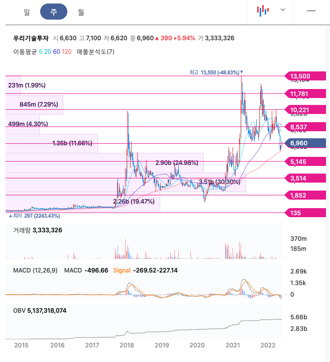 우리기술투자의 주가는 21년 3월 증가하여 4월 최고 13,550원을 찍고 조정을 받았습니다.