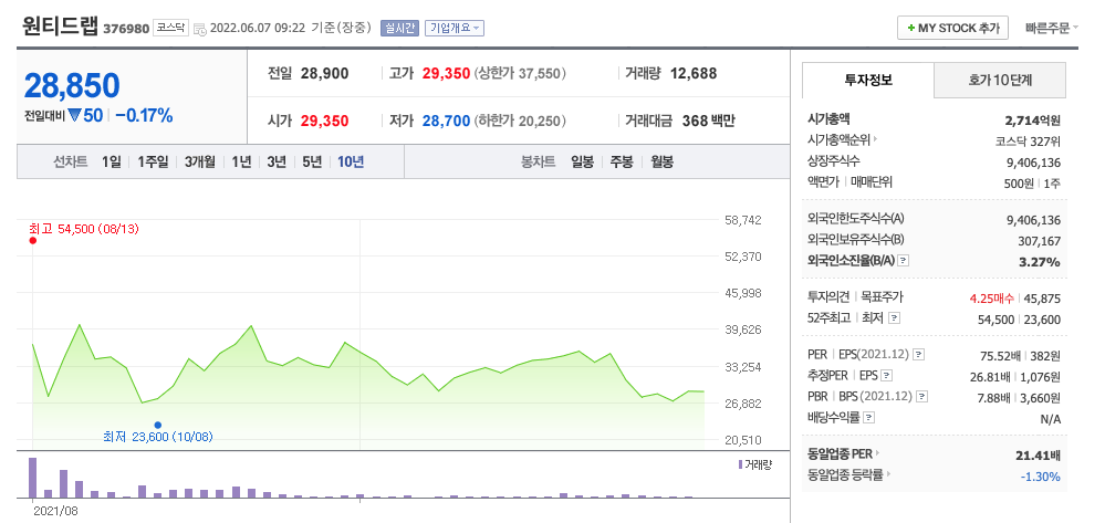 원티드랩의 주가는 급등락을 오가다가 21년 11월 최고 43,550원을 찍고 조정을 받았습니다.
