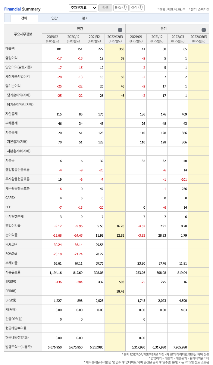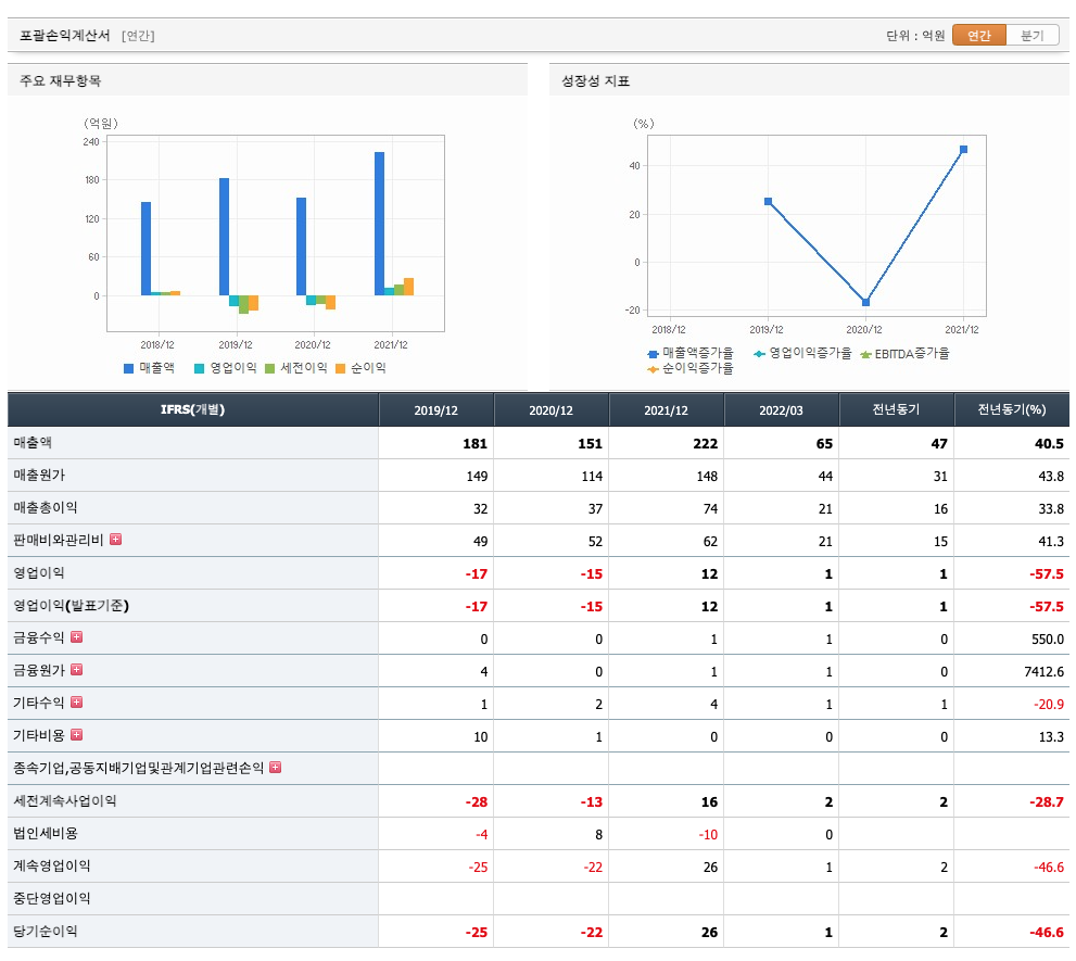 매출액 : 2019년 181억원, 2020년 151억원, 2021년 222억원, 2022년 1분기 65억원으로 전년동기대비 증가하였습니다. 2022년 1분기는 전년동기대비 40.5% 증가하였습니다. 2021년 분기별로 보면 3분기 41억원, 2022년 1분기 65억원입니다.