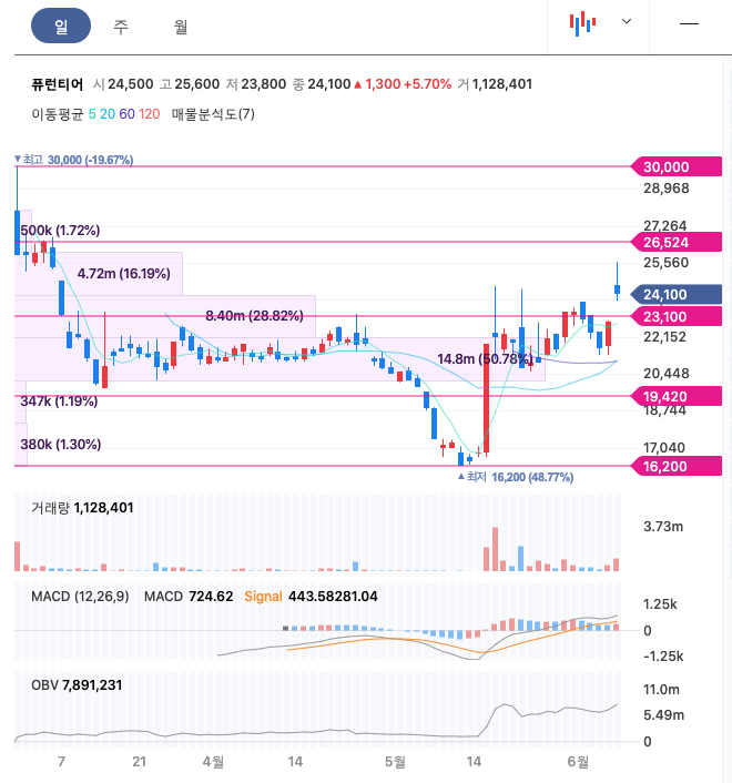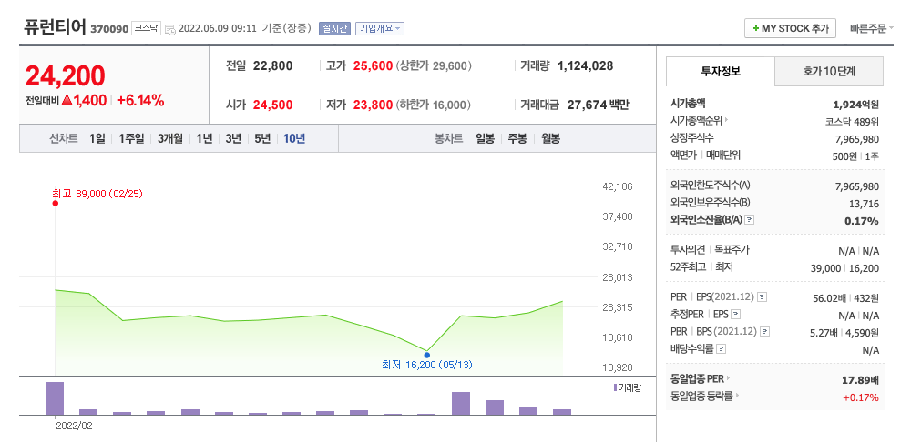 퓨런티어의 주가는 상장이후 조정을 받은 뒤 증가하고 있습니다.