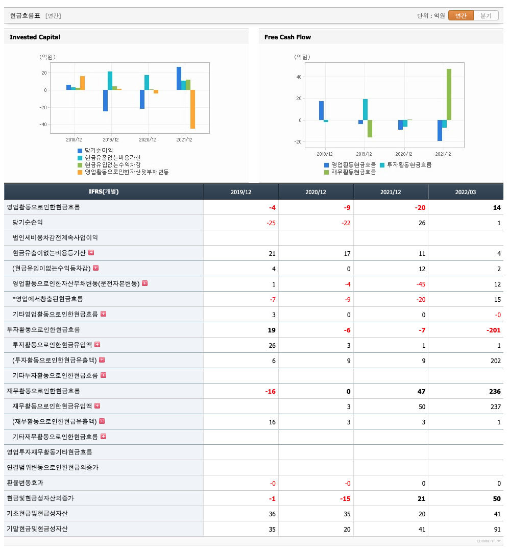 영업활동 현금흐름 : 2019년 -4억원, 2020년 -9억원, 2021년 -20억원, 2022년 1분기 14억원으로 2022년 1분기의 영업활동 현금흐름이 원활합니다.