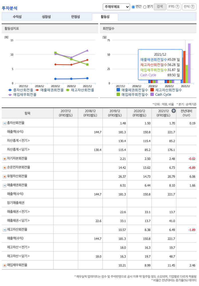 재고자산회전율(높을 수록 좋습니다) : 2019년 약 16억원, 2020년 약 19억원, 2021년 약 48억원이고, 회전율은 2019년 약 10%, 2020년 약 8%, 2021년 약 6%로 안정적입니다.