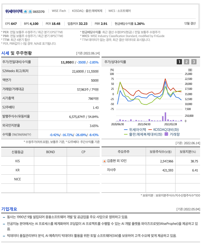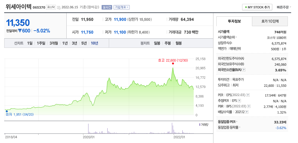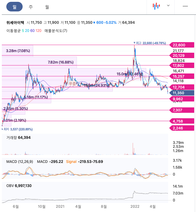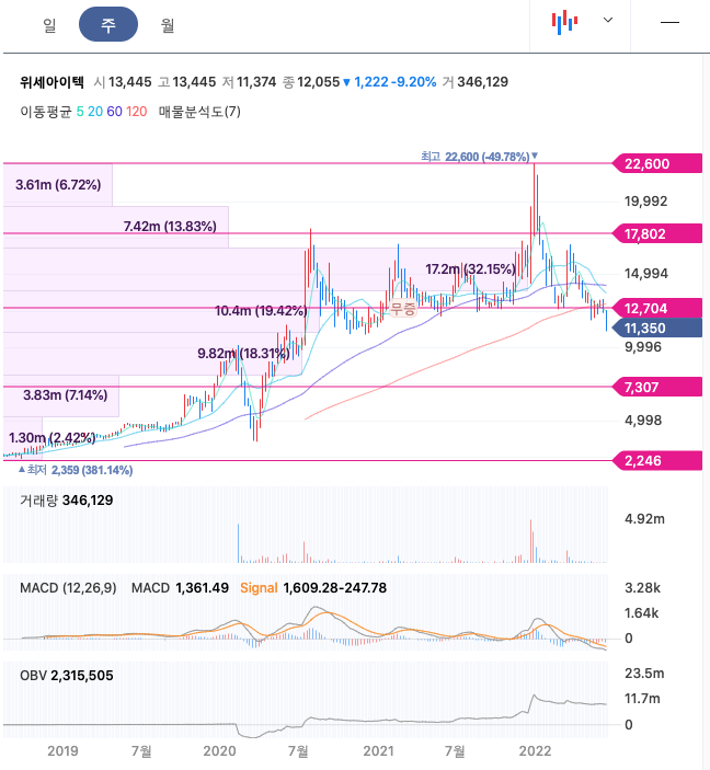 위세아이텍의 주가는 21년 11월 급등하여 22년 1월 최고 22,600원을 찍고 조정을 받았습니다.