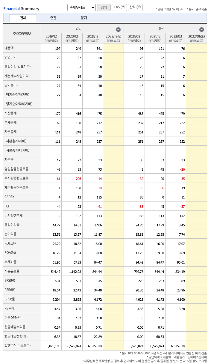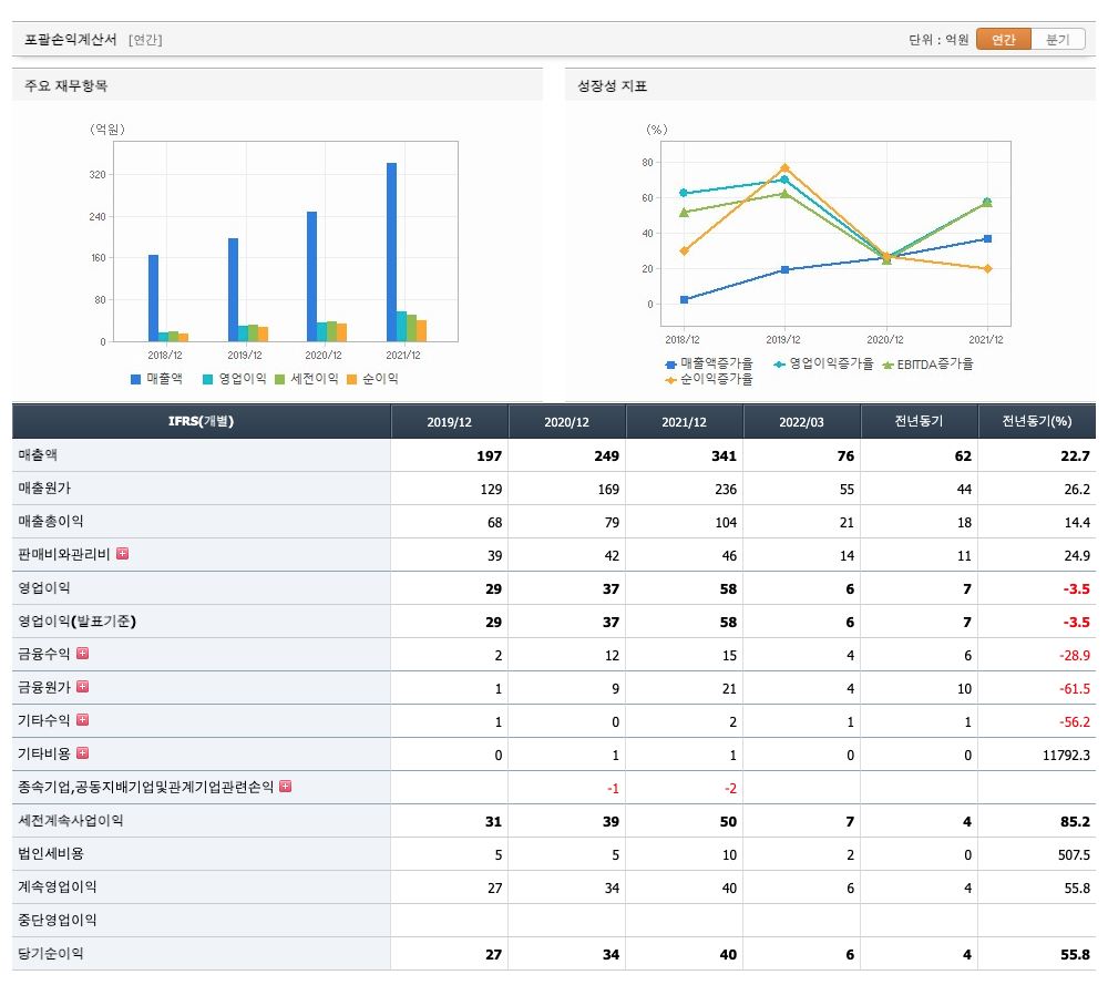 매출액 : 2019년 197억원, 2020년 249억원, 2021년 341억원, 2022년 1분기 76억원으로 전년동기대비 증가하였습니다. 2022년 1분기는 전년동기대비 22.7% 증가하였습니다. 2021년 분기별로 보면 2분기 65억원, 3분기 93억원, 4분기 121억원, 2022년 1분기 76억원입니다.