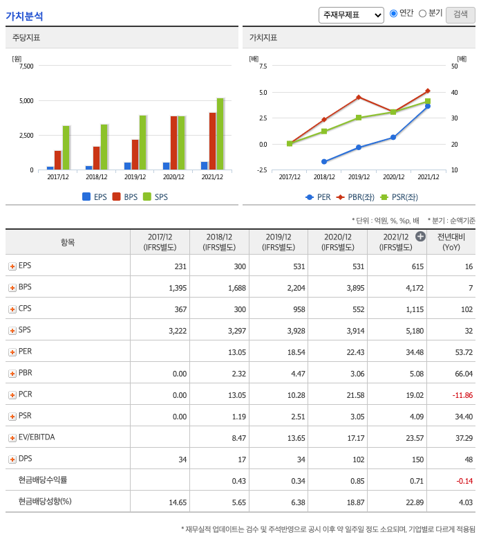 DPS(Dividend Per Share의 약자, 총배당금을 총주식발생수로 나눈 것, 한 주당 얼만큼의 배당금을 받을 수 있는지 알 수 있는 지표, DPS가 높을 수록 배당금이 많은 것임) : 2017년 34원, 2018년 17원, 2019년 34원, 2020년 102원, 2021년 150원으로 전년동기 증가하였습니다.