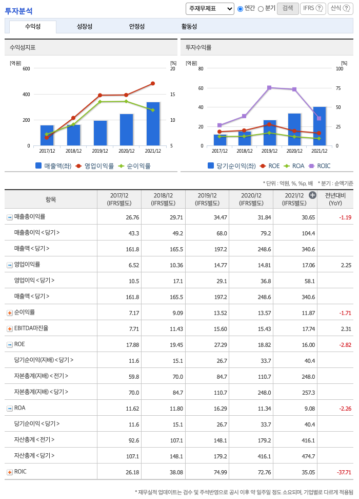 ROE(Return On Equity, 자기자본순이익율, 주주의 관점) : 2017년 약 17%, 2018년 약 19%, 2019년 약 27%, 2020년 약 18%, 2021년 약 16%이고, 자기자본순이익율은 이상율(10%)보다 높습니다.