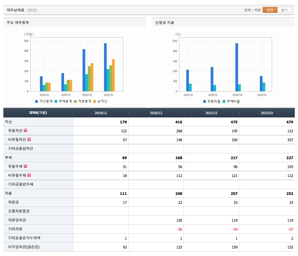 자산은 2019년 179억원, 2020년 416억원, 2021년 475억원, 2022년 1분기 479억원으로 증가하였습니다.