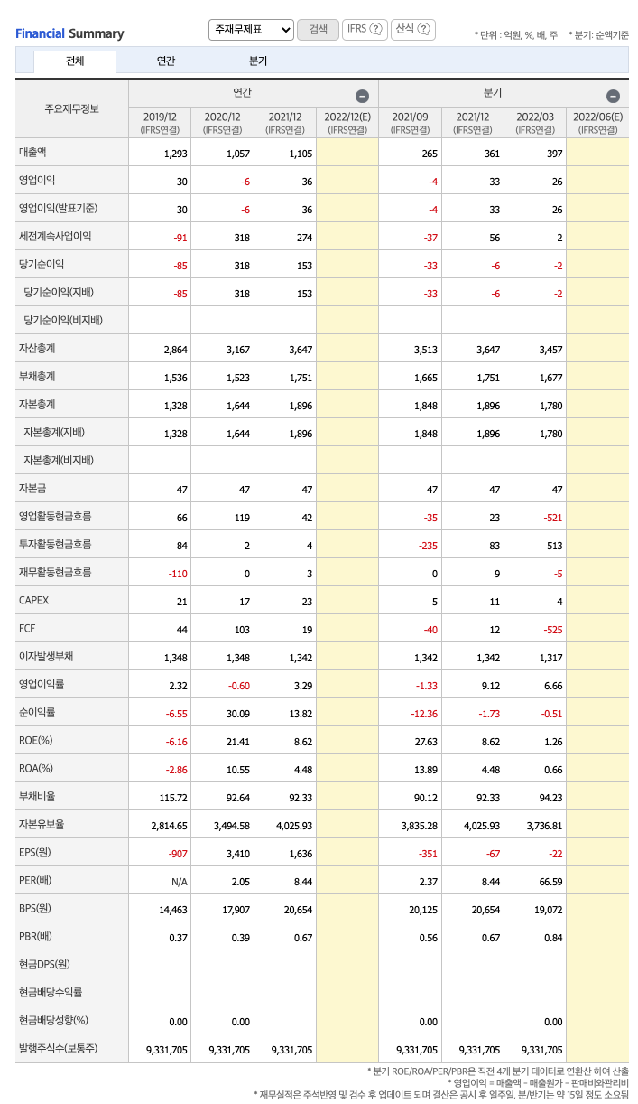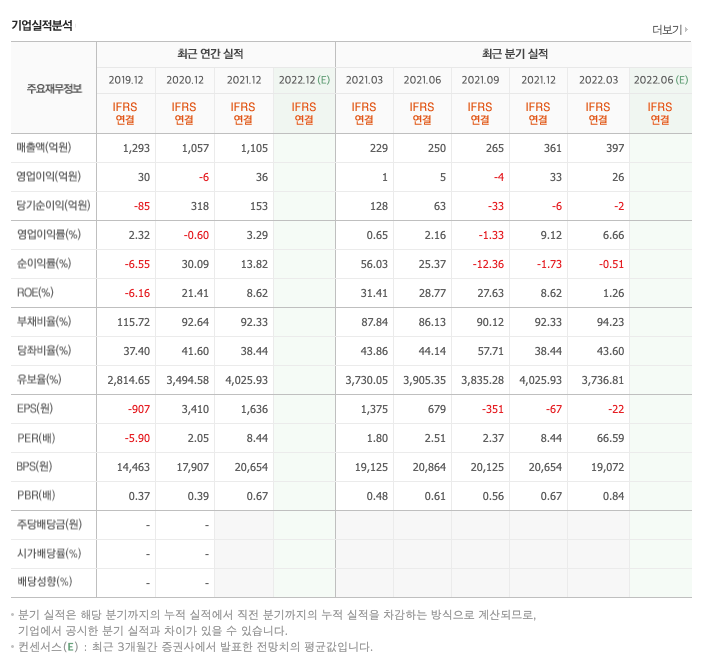 매출액 : 2019년 1293억원, 2020년 1057억원, 2021년 1105억원, 2022년 1분기 397억원으로 전년동기대비 증가하였습니다. 2022년 1분기는 전년동기대비 73.2% 증가하였습니다. 2021년 분기별로 보면 2분기 250억원, 3분기 265억원, 4분기 361억원, 2022년 1분기 397억원입니다.