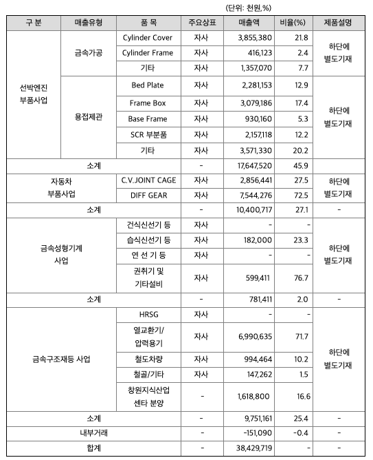 당사는 제조업을 주업으로 하는 회사로서 선박엔진부품과 자동차부품, 금속성형기계, 금속구조재등을 생산하는 사업을 영위하고 있으며 당사 및 종속회사의 사업부문별 현황을 요약하면 아래와 같습니다.