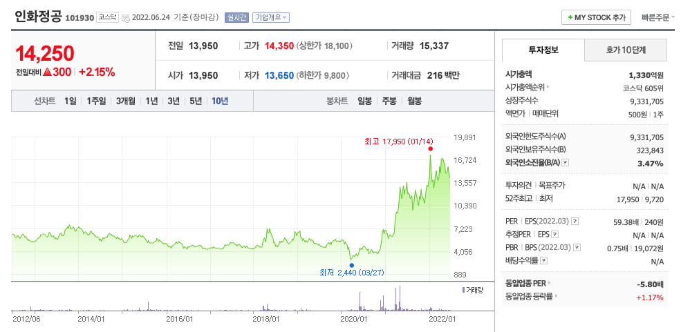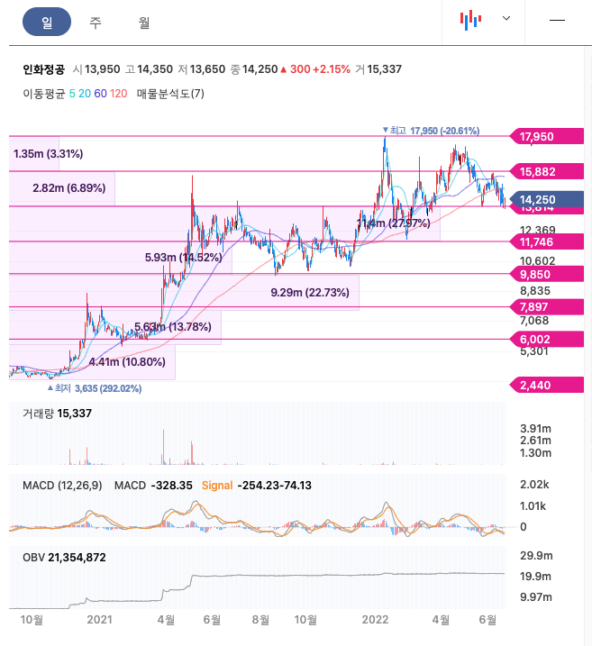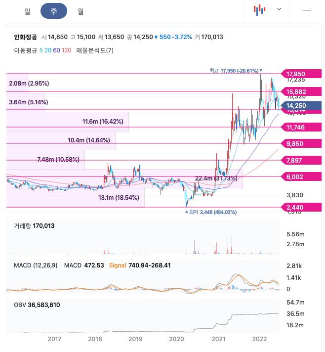 인화정공의 주가는 21년 11월 증가하여 22년 1월 최고 17,950원을 찍고 조정을 받았습니다.
