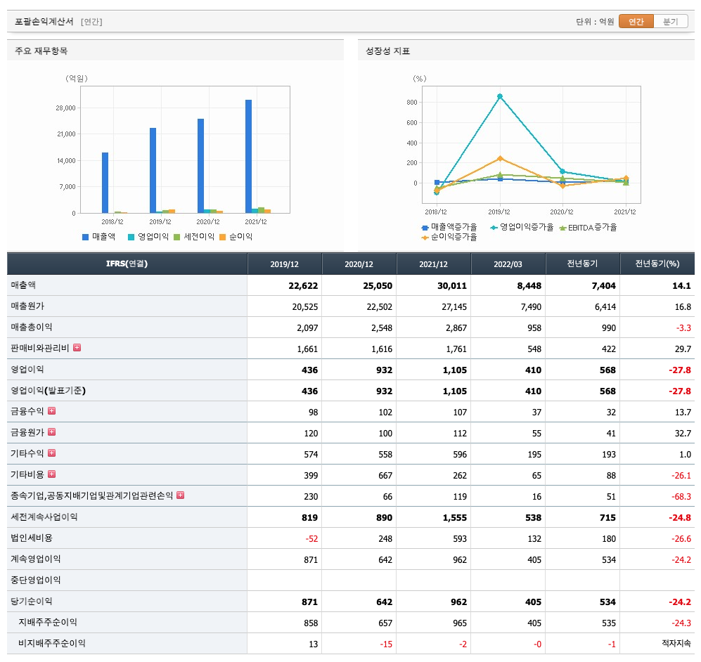 매출액 : 2019년 22,622억원, 2020년 25,050억원, 2021년 30,011억원, 2022년 1분기 8448억원으로 전년동기대비 증가하였습니다. 2022년 1분기는 전년동기대비 14.1% 증가하였습니다. 2021년 분기별로 보면 2분기 7199억원, 3분기 7128억원, 4분기 8281억원, 2022년 1분기 8448억원입니다.