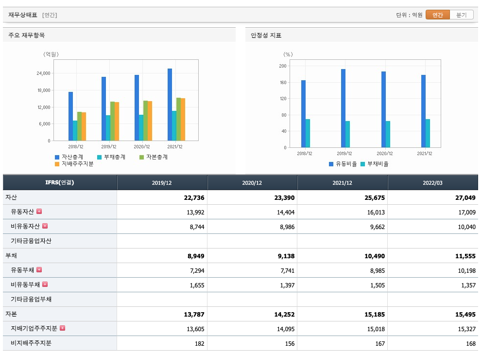 재무활동 현금흐름 : 2019년 457억원, 2020년 213억원, 2021년 775억원, 2022년 1분기 1억원으로 영업활동 현금흐름이 플러스입니다.