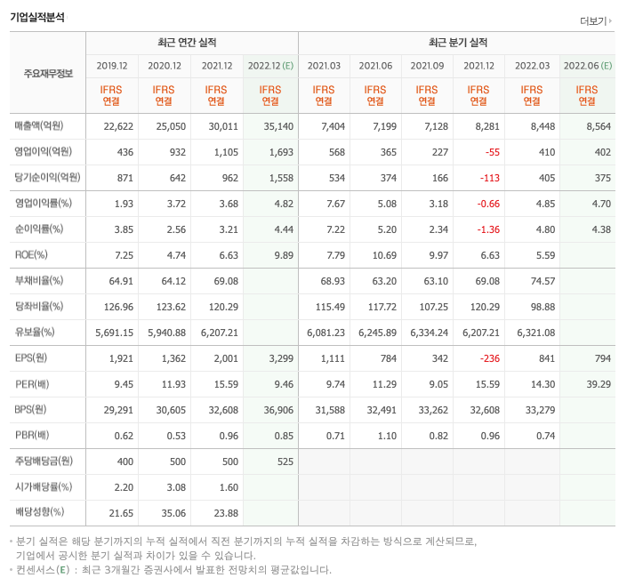 영업이익 : 2019년 436억원, 2020년 932억원, 2021년 1105억원, 2022년 1분기 410억원으로 전년동기대비 감소하였습니다. 2022년 1분기는 전년동기대비 -27.8% 감소하였습니다. 2021년 분기별로 보면 2분기 365억원, 3분기 227억원, 4분기 -55억원, 2022년 1분기 410억원입니다.