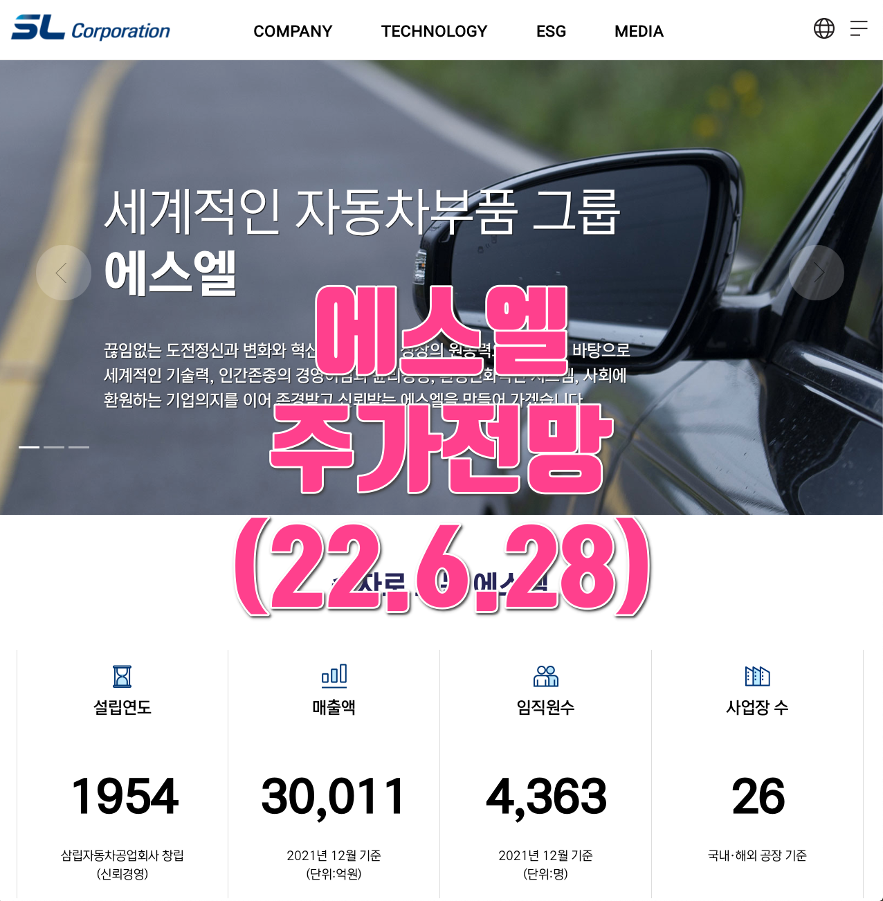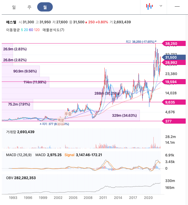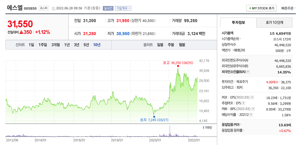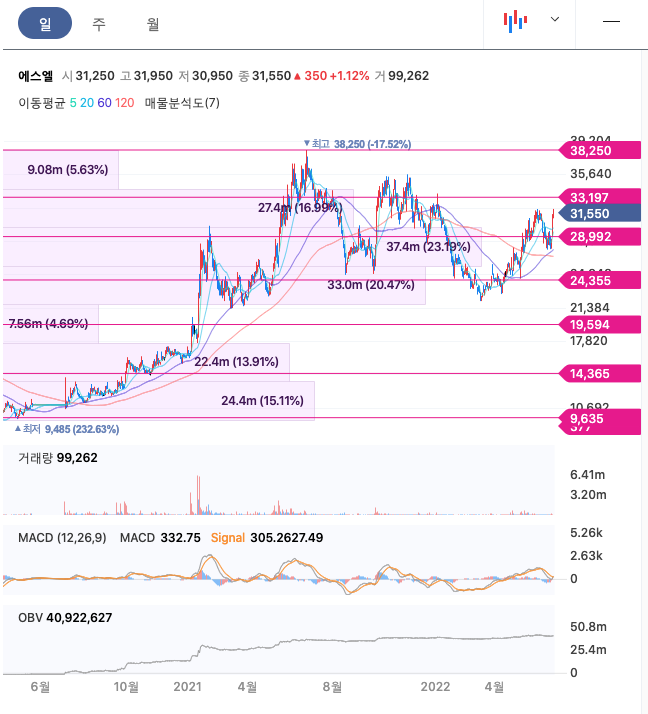 에스엘의 주가는 21년 1월 급등하여 6월 최고 38,250원을 찍고 보합 및 조정을 받았습니다.