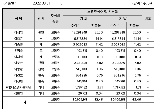 2022년 3월 31일 현재 당사의 최대주주 및 그 특수관계인은 30,109,161주를 보유 하고 있습니다. 이는 최대주주 본인과 친인척, 계열회사가 소유하고 있는 주식수를 합산한 것으로 발행주식총수의 62.46%에 해당합니다.