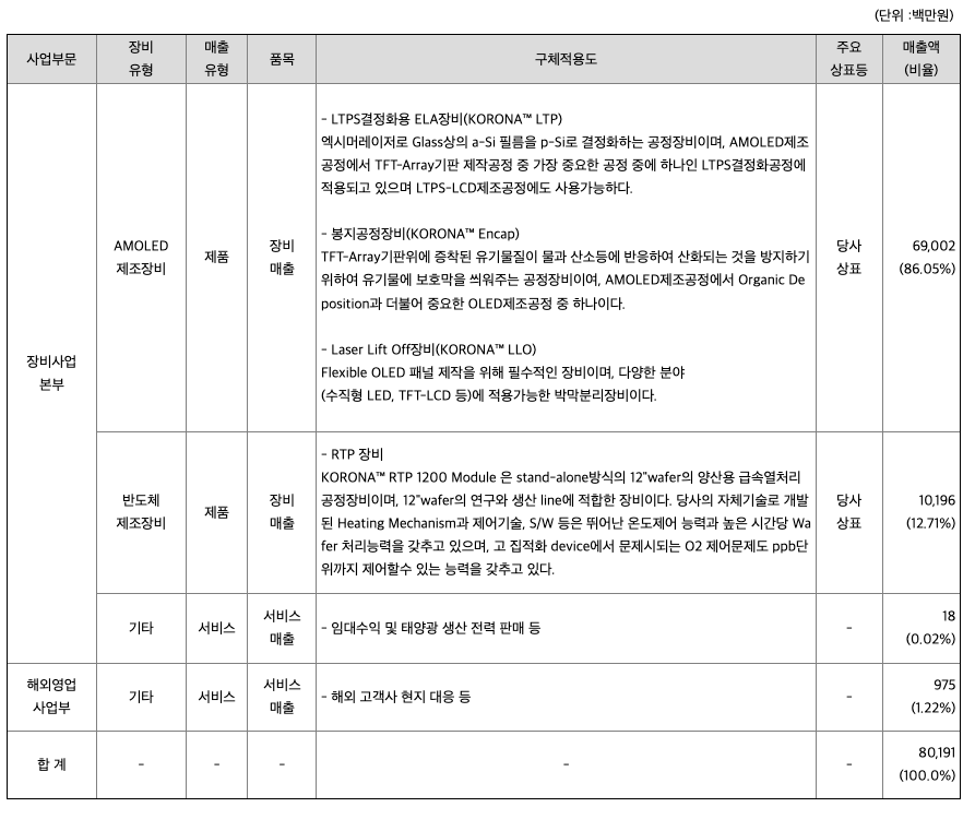 당사는 디스플레이 및 반도체 장비를 생산하는 장비회사입니다. 2022년 1분기 연결재무제표 기준 매출액은 802억원이며 이 중 수출은 439억원, 국내 매출은 363억원입니다. 사업부문별로는 디스플레이 사업부문과 반도체사업부문으로 나눌 수 있으며 매출은 디스플레이 사업부문 690억, 반도체 사업부문 102억원, 기타 매출 10억원입니다.