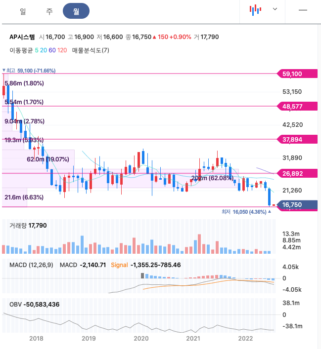 AP시스템의 주가는 20년 11월 상승하여 21년 6월 최고 34,200원을 찍고 조정을 받았습니다.