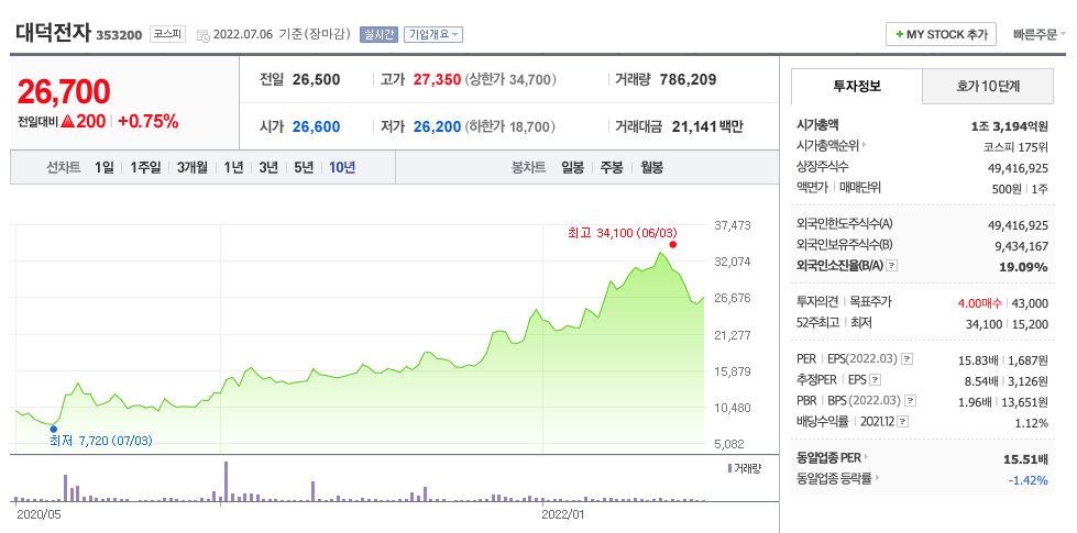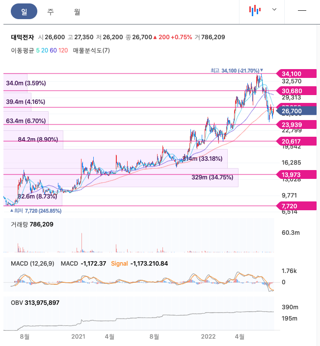 대덕전자의 주가는 20년 12월 상승하여 22년 5월 최고 34,100원을 찍고 조정을 받았습니다.+