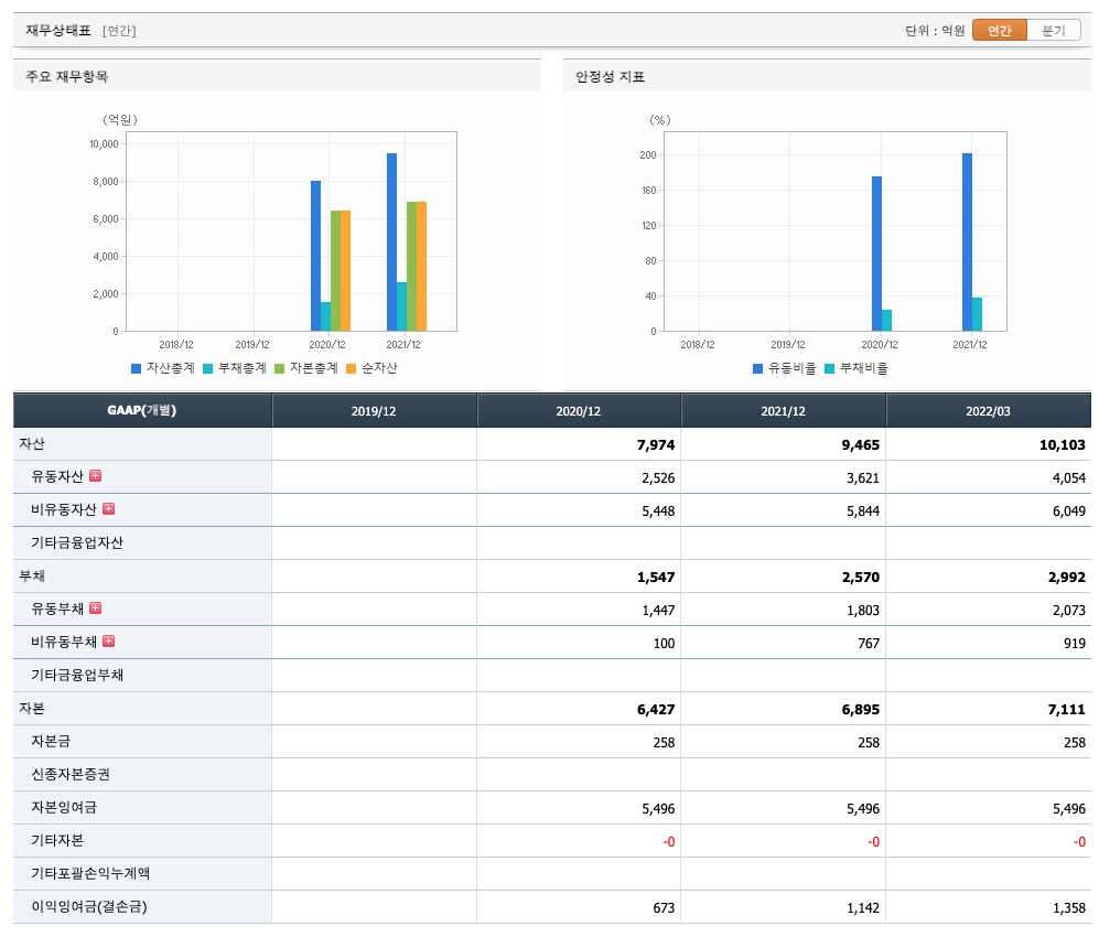 유보율 : 2020년 약 2388%, 2021년 약 2546%로 증가하고 있으며, 표준(100%)보다 높아 유보율이 안정적입니다.