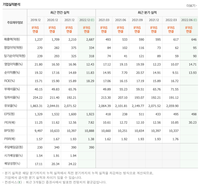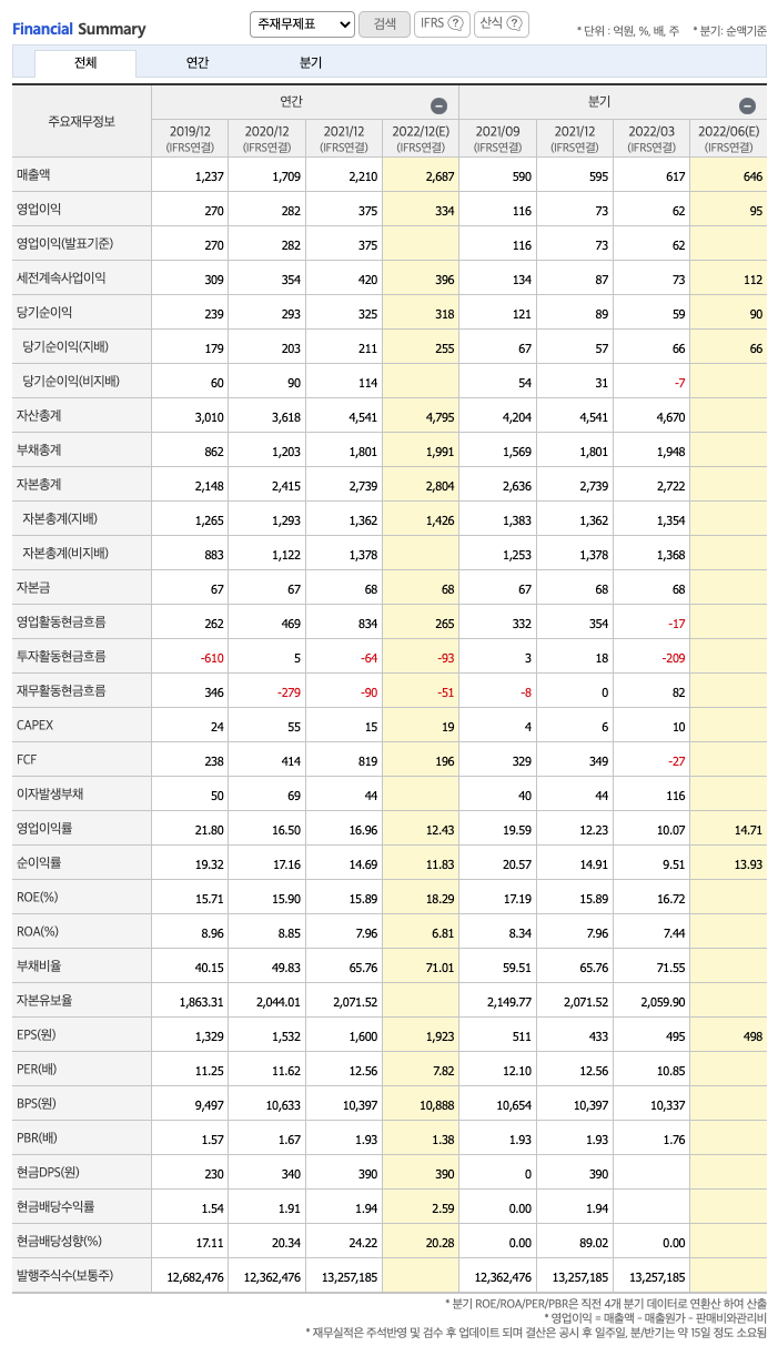 2022년 1분기 연결 기준 영업성과는 매출액 617억원, 영업이익은 62억원, 당기순이익은 59억원을 기록 하였습니다. 자산총계는 4,670억원, 부채총계는 1,948억원, 자본총계는 2,722억원으로 마감 되었습니다.