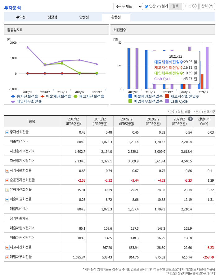 **매출채권회전일수(=돈을 받는 순환일 수, 낮을 수록 좋습니다) 약 29일, 재고자산회전일수(=재고자산 빠지는 일수, 높을 수록 좋습니다) 약 16일, 매입채무회전일수(=돈을 늦게 줘도 되는 일 수, 높을 수록 좋습니다) 약 0.59일이고, Cash Cycle(현금회전율, 낮을 수록 좋습니다) 약 45일로 현금운영입니다.