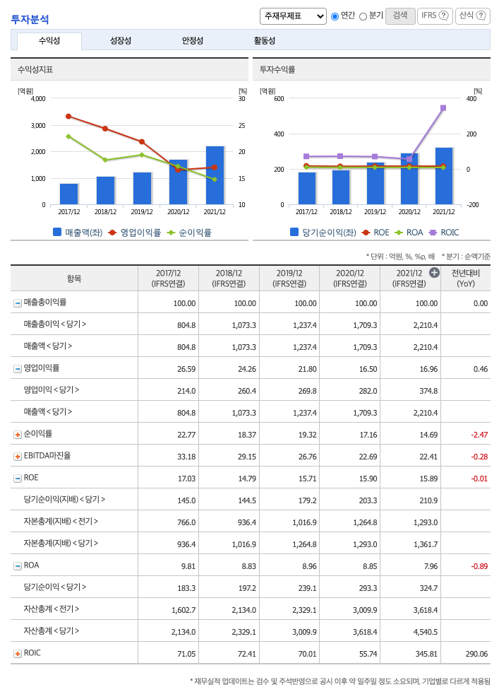 매출액 : 2019년 1237억원, 2020년 1709억원, 2021년 2210억원, 2022년 1분기 617억원으로 전년동기대비 증가하였습니다. 2022년 1분기는 전년동기대비 25.3% 증가하였습니다. 2021년 분기별로 보면 2분기 553억원, 3분기 590억원, 4분기 595억원, 2022년 1분기 617억원입니다.