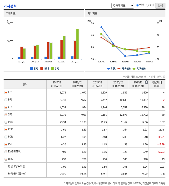 DPS(Dividend Per Share의 약자, 총배당금을 총주식발생수로 나눈 것, 한 주당 얼만큼의 배당금을 받을 수 있는지 알 수 있는 지표, DPS가 높을 수록 배당금이 많은 것임) : 2017년 250원, 2018년 260원, 2019년 230원, 2020년 340원, 2021년 390원으로 전년동기 증가하였습니다.