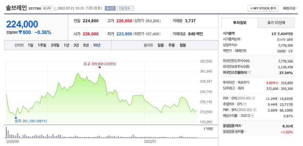 솔브레인의 주가는 20년 11월 반등하여 21년 7월 최고 372,600원을 찍고 조정을 받았습니다.