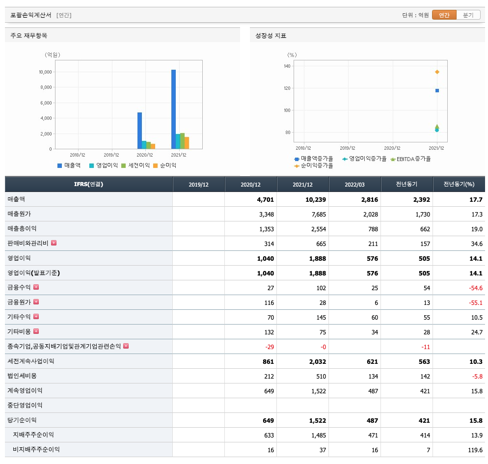 매출액 : 2020년 4701억원, 2021년 10239억원, 2022년 1분기 2816억원으로 전년동기대비 증가하였습니다. 2022년 1분기는 전년동기대비 17.7% 증가하였습니다. 2021년 분기별로 보면 2분기 2435억원, 3분기 2759억원, 4분기 2653억원, 2022년 1분기 2816억원입니다.