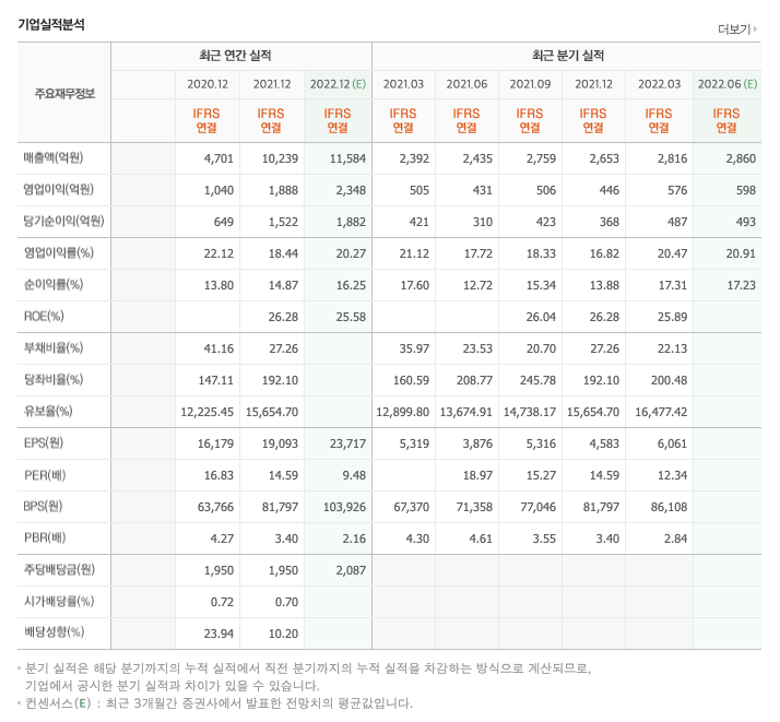 FCF(미래현금흐름) : 2020년 1216억원, 2021년 697억원으로 CAPEX가 좋습니다. 2022년은 1375억원으로 추정됩니다.
