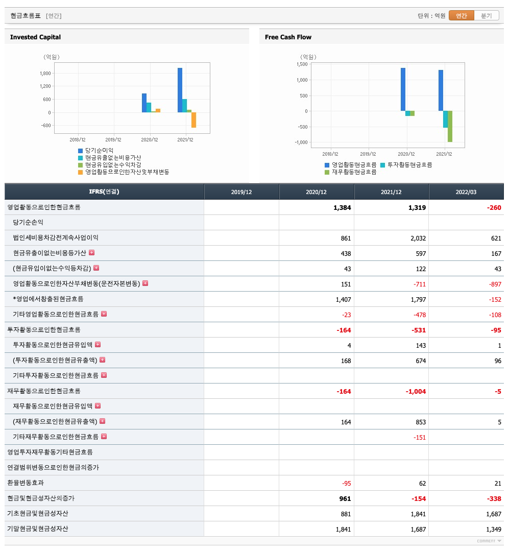 투자활동 현금흐름 : 2020년 -164억원, 2021년 -531억원, 2022년 1분기 -95억원으로 영업활동 현금흐름이 원활합니다.