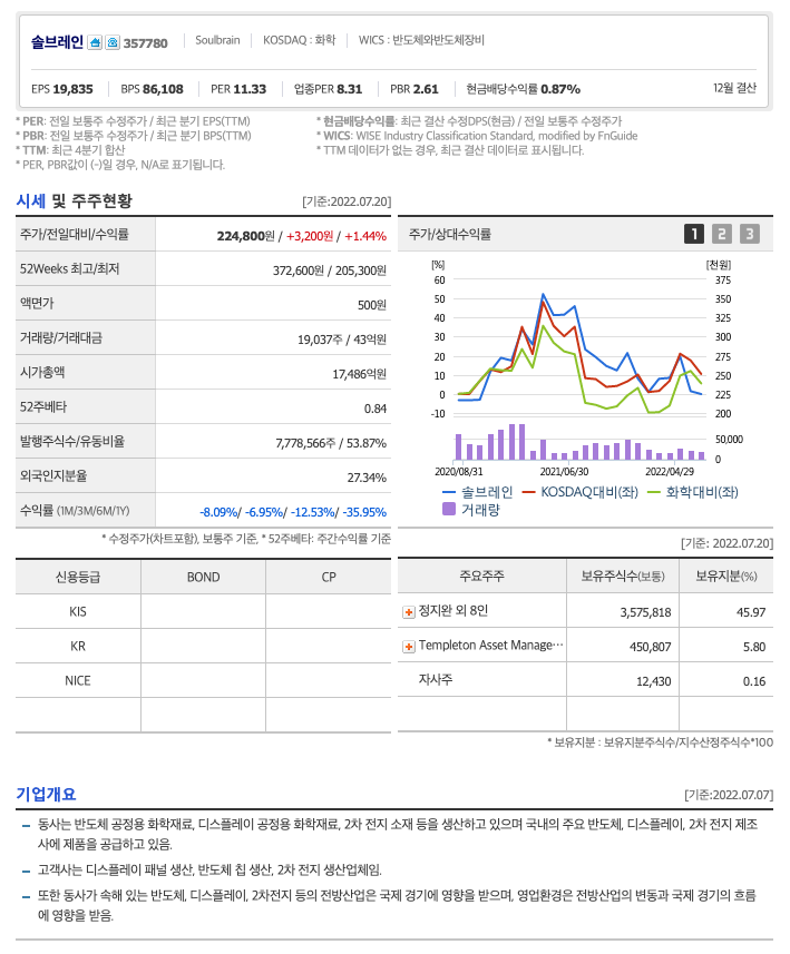 | 솔브레인 | 223,900원 | 248,358원 | 246,295원 | 250,341원 |