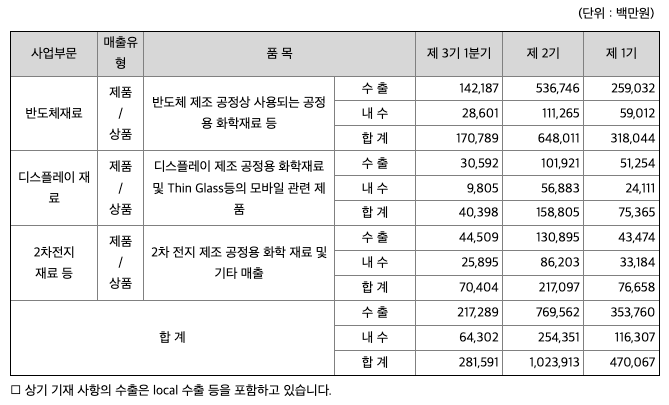 당사의 사업부문은 반도체 재료 부문, 디스플레이 재료 부문, 2차 전지 재료 부문으로 나뉠 수 있습니다.
