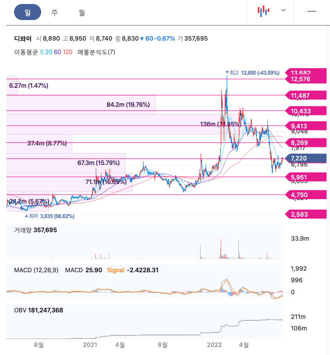 디와이의 주가는 21년 11월 증가하여 22년 2월 최고 12,800원을 찍고 조정을 받았습니다.