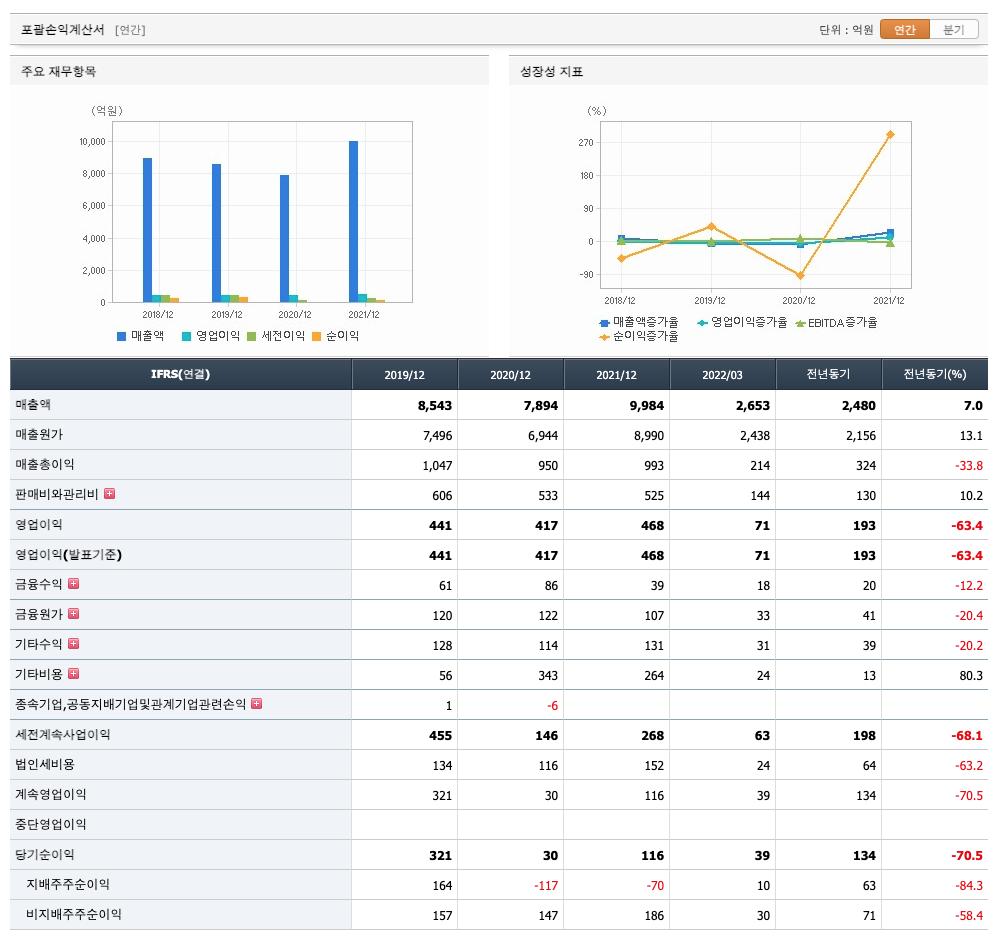 매출액 : 2019년 8543억원, 2020년 7894억원, 2021년 9984억원, 2022년 1분기 2653억원으로 전년동기대비 증가하였습니다. 2022년 1분기는 전년동기대비 7% 증가하였습니다. 2021년 분기별로 보면 2분기 2503억원, 3분기 2399억원, 4분기 2602억원, 2022년 1분기 2653억원입니다.