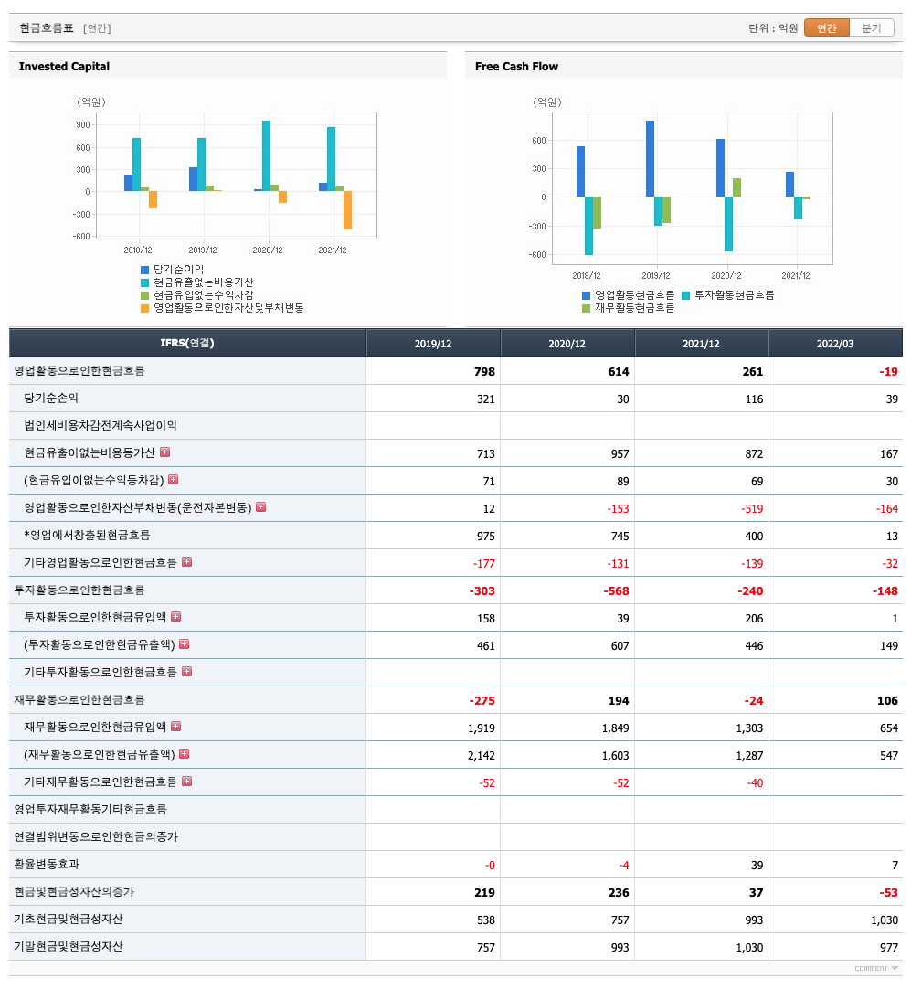 투자활동 현금흐름 : 2019년 -303억원, 2020년 -568억원, 2021년 -240억원, 2022년 1분기 -148억원으로 영업활동 현금흐름이 원활합니다.