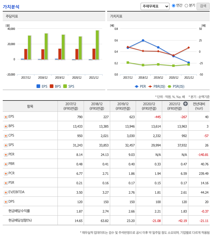 ROE(Return On Equity, 자기자본순이익율, 주주의 관점) : 2017년 약 6%, 2018년 약 1%, 2019년 약 4%, 2020년 약 -3%, 2021년 약 -2%이고, 자기자본순이익율은 이상율(10%)보다 낮습니다.