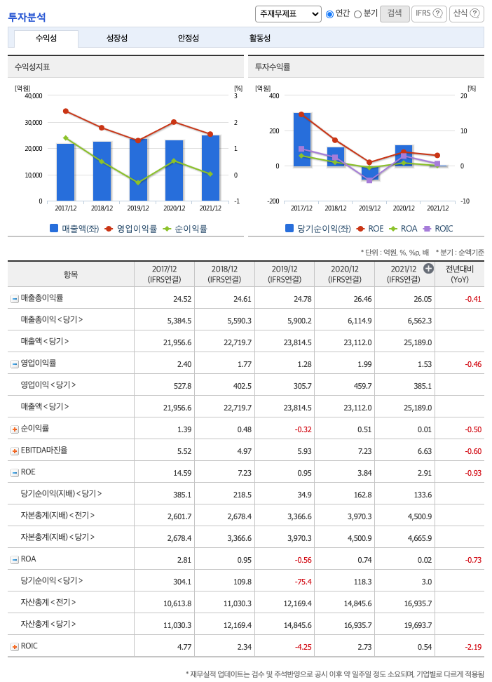 ROA(Return On Assets, 총자산순이익율, 경영자의 관점) : 2017년 약 2%, 2018년 약 0.95%, 2019년 약 -0.56%, 2020년 약 0.74%, 2021년 약 0.02%이고, 자기자본순이익율은 이상율(10%)보다 낮습니다.