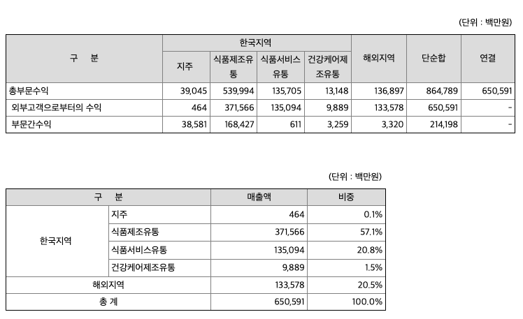 영업부문은 지주부문, 식품제조유통사업부문, 식품서비스유통사업부문, 건강케어제조유통사업부문, 해외부문으로 구분하고 있습니다.