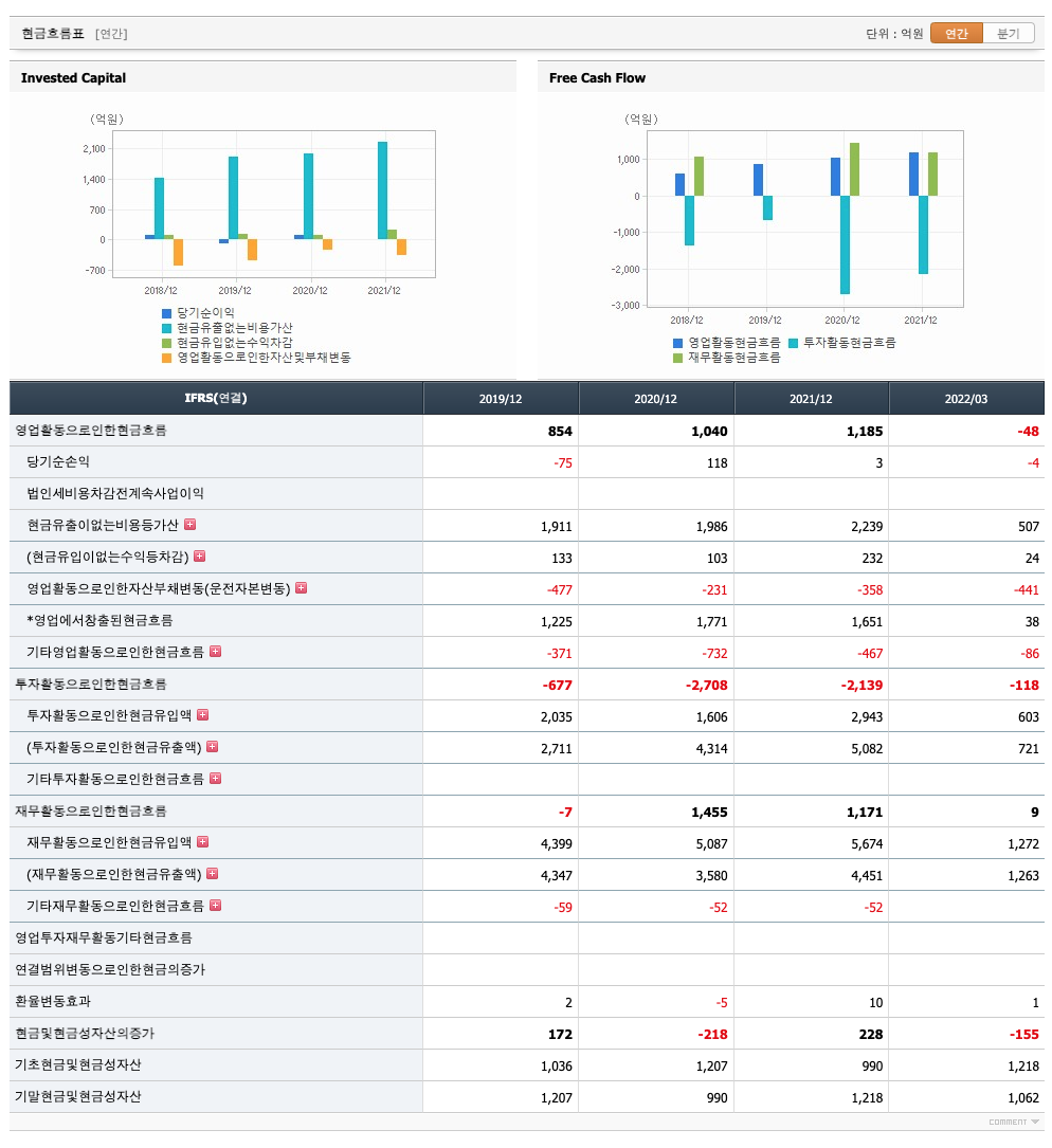 투자활동 현금흐름 : 2019년 -677억원, 2020년 -2708억원, 2021년 -2139억원, 2022년 1분기 -118억원으로 영업활동 현금흐름이 원활합니다.