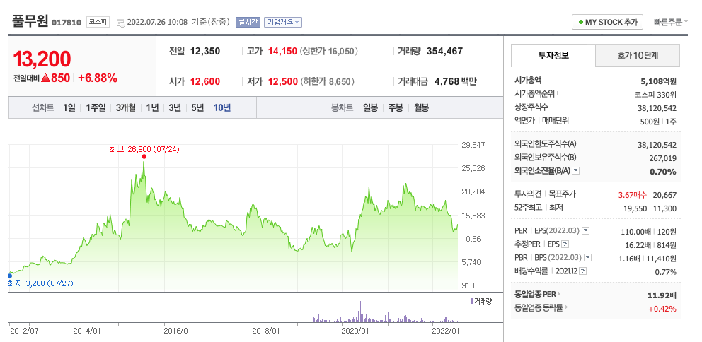 | 풀무원 | 13,150원 | 14,840원 | 14,208원 | 14,206원 |