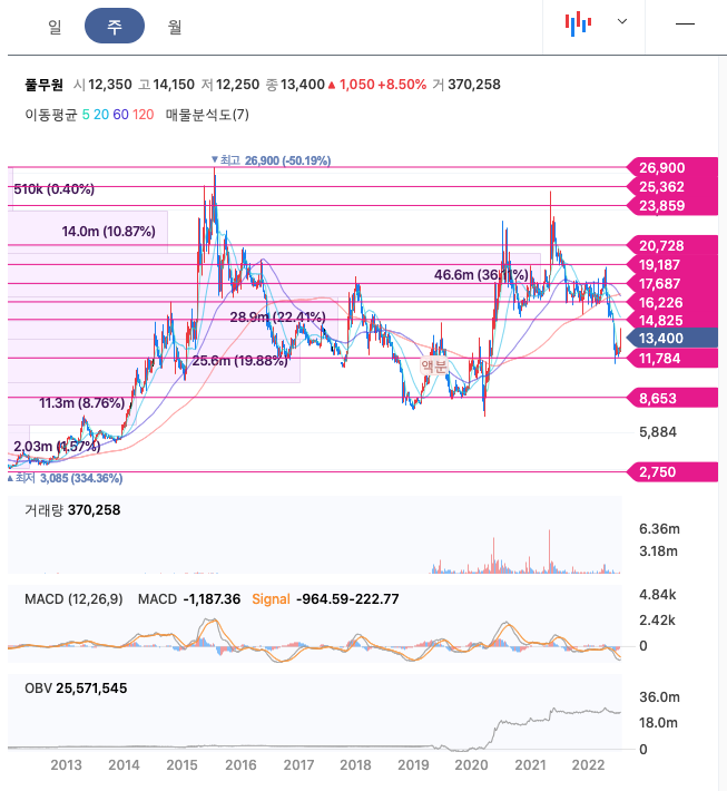 풀무원의 주가는 20년 4월 급등하여 21년 5월 최고 25,000원을 최고로 조정을 받았습니다.