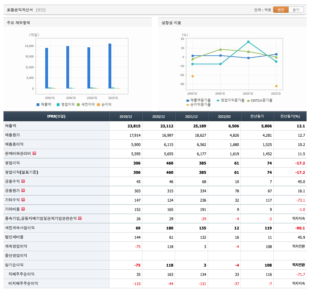 매출액 : 2019년 23,813억원, 2020년 23,112억원, 2021년 25,189억원, 2022년 1분기 6506억원으로 전년동기대비 증가하였습니다. 2022년 1분기는 전년동기대비 12.1% 증가하였습니다. 2021년 분기별로 보면 2분기 6351억원, 3분기 6615억원, 4분기 6417억원, 2022년 1분기 6506억원입니다.