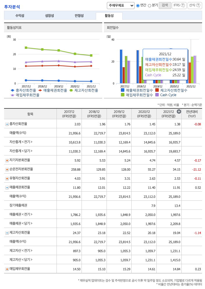 매출채권회전율(높을 수록 좋습니다) : 2019년 약 2050억원, 2020년 약 1997억원, 2021년 약 2209억원이고, 회전율은 2019년 약 12%, 2020년 약 11%, 2021년 약 11%로 안정적입니다.