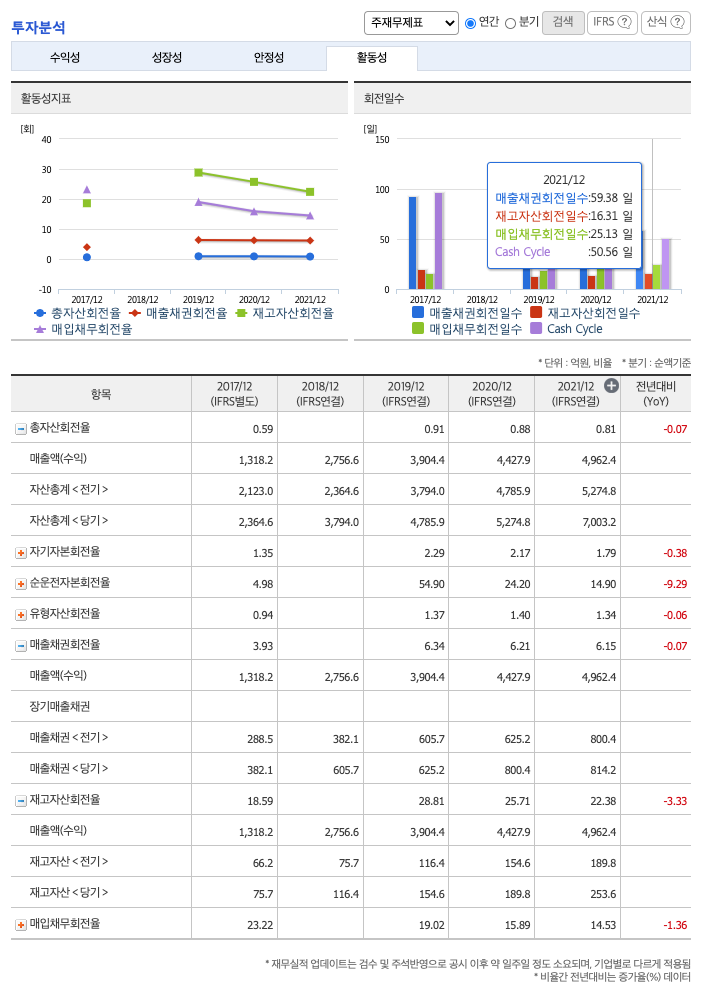 재고자산회전율(높을 수록 좋습니다) : 2019년 약 154억원, 2020년 약 189억원, 2021년 약 253억원이고, 회전율은 2019년 약 28%, 2020년 약 25%, 2021년 약 22%로 안정적입니다.