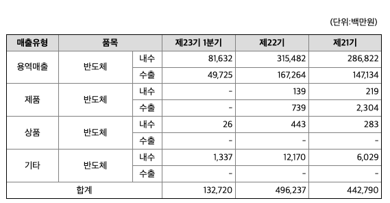 당사는 반도체 후공정관련 Bump, Test, Back-End 등 단일사업부문으로 구성되어 있으며, 매출실적은 아래와 같습니다.