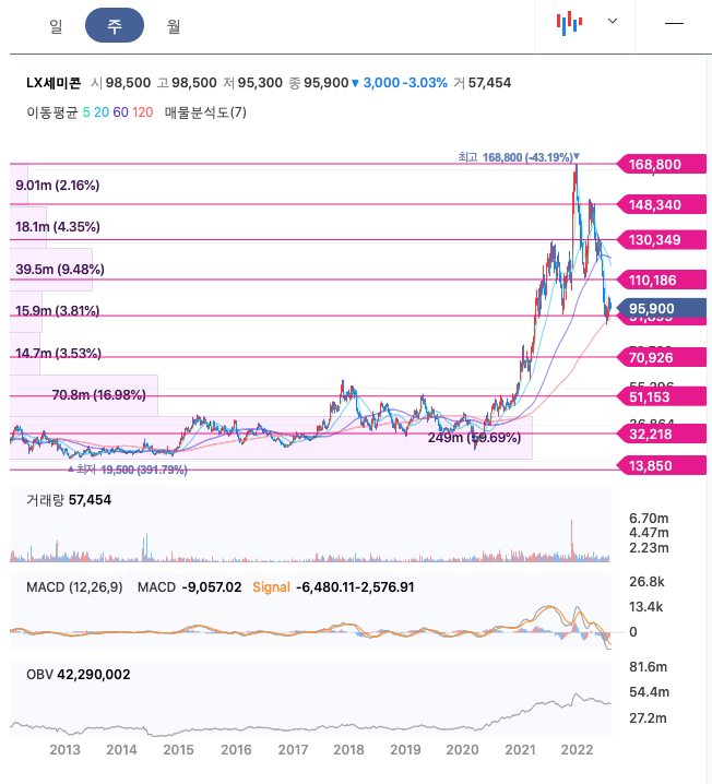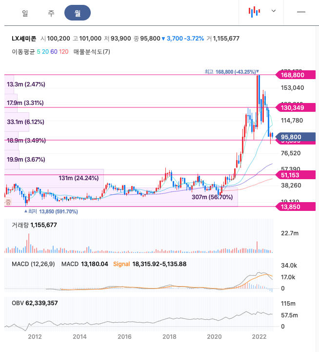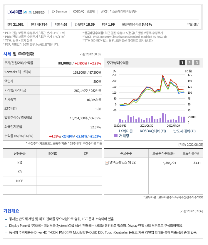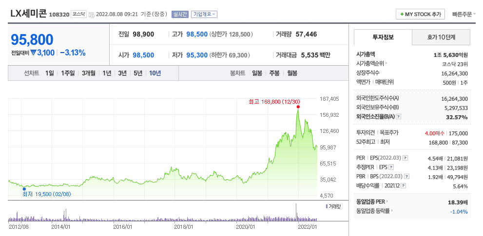 LX세미콘의 주가는 21년 3월 증가하여 22년 1월 최고 168,000원을 찍고 조정을 받았습니다.